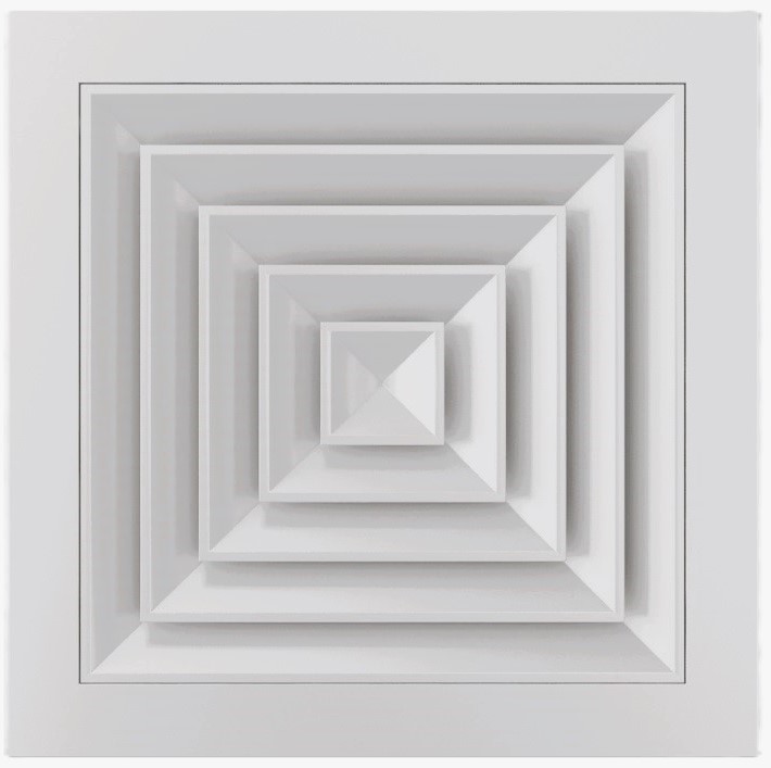 دریچه سقفی چهارگوش جزء پرکاربرد ترین دریچه ها میباشد که جریان یکنواخت هوا را به صورت افقی توسط پره های متوالی هم مرکز انجام میدهد و قابلیت پخش هوا در جهت های یک الی چهار طرف را دارند.